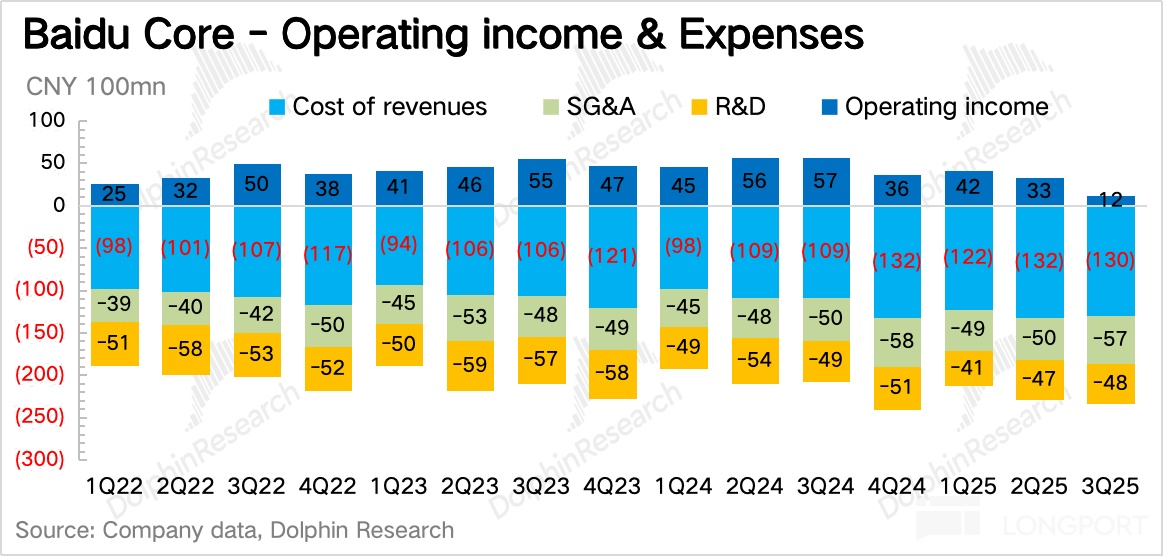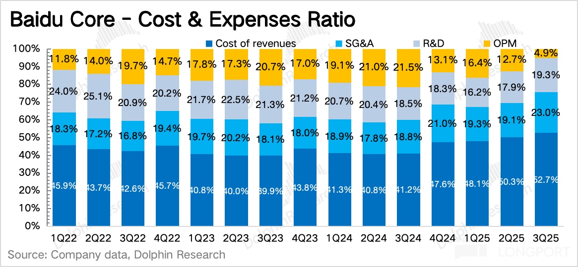 4. 核心利润率压力释放:百度核心的主业经营利润,也就是毛利润减掉三项经营费用,Q3 下降到了 12 亿,利润率仅 5%,远低于正常时期水平。这与多个因素相关:1)业务结构变动。AI 业务的收入上来了,但是利润率很低,因此这部分拉低综合水平。2)Q3 营销费用增长明显,可能与云、AI 应用的推广有关,包括销售团队的搭建以及宣传支出。