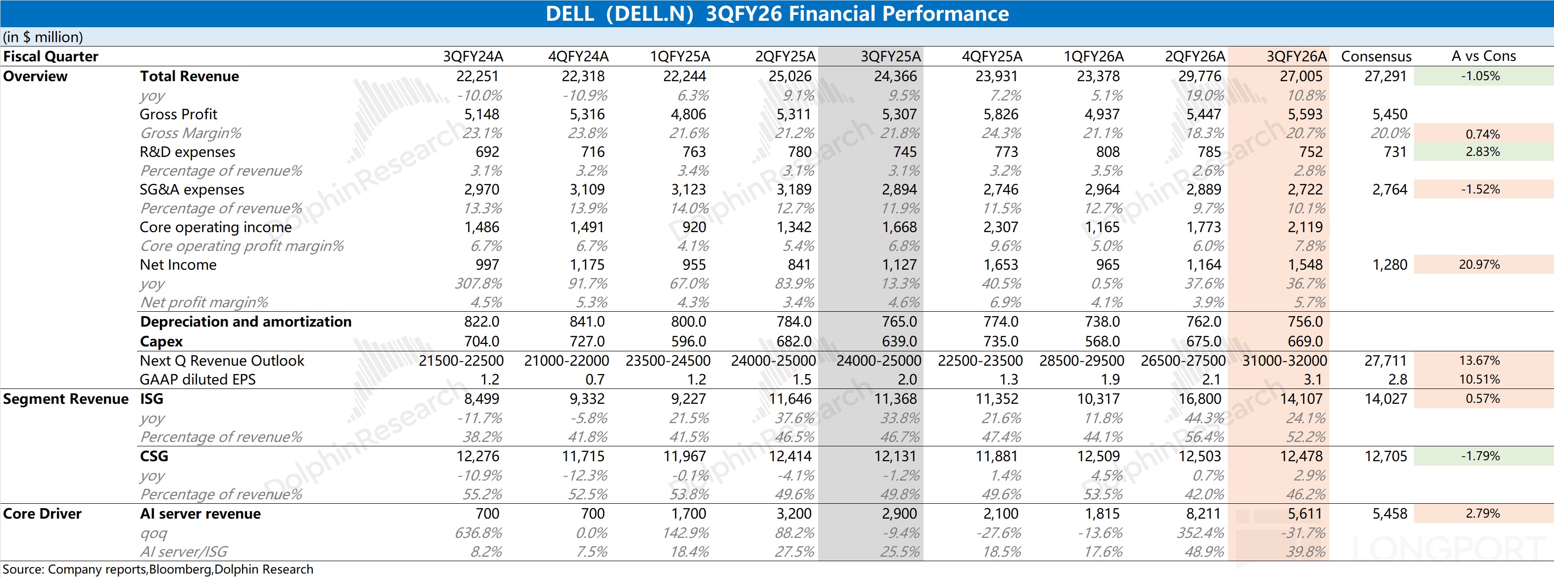 以下为海豚君整理的戴尔 2026 财年第三季度的财报电话会纪要,财报解读请移步《戴尔 DELL:存储涨价添堵?AI 指引再撑腰》