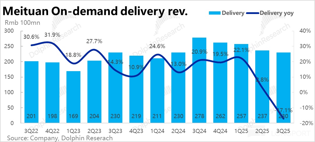 首先,和到家业务(即外卖 + 闪购)强绑定的配送性收入本季同比显著下滑了 17%,虽然公司不再披露单量数据,但结合市场调研本季即配单量同比增长应当有 15% 上下(仅做参考),隐含单价配送收入同比减少了约 45%。