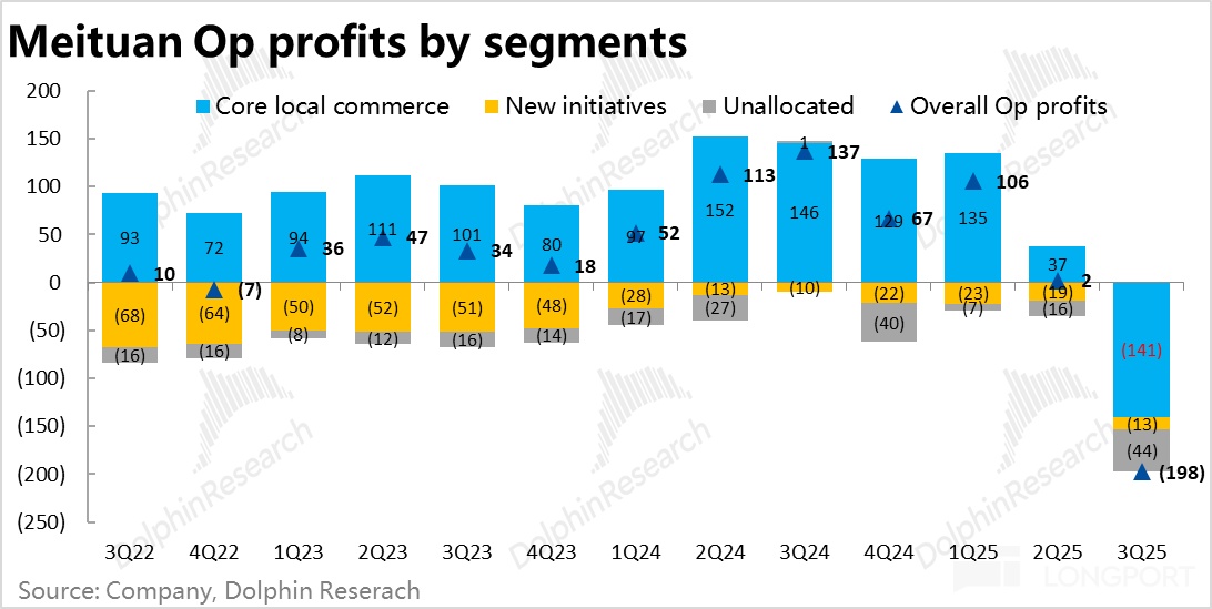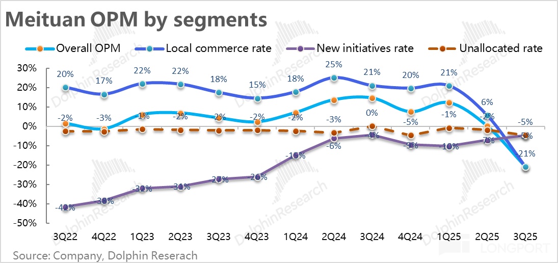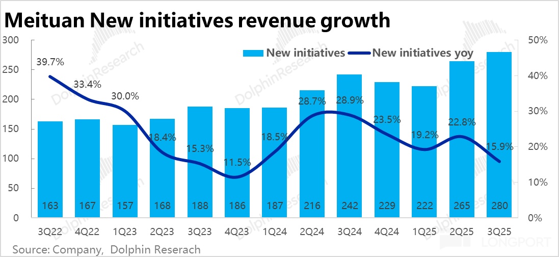 至于本季新业务的亏损则让人意外的环比不增反降,本季为亏损 12.8 亿(vs.上季 18.8 亿)。考虑到海外 Keeta 和闪购前者仓在投入期,亏损反而减少,再结合业务收入增长的放缓,很可能是包括优选、乃至小象超市和如快驴等其他业务的收缩力度都比预期的更高。