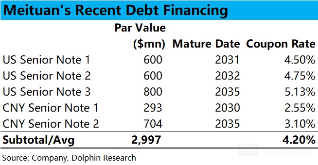 因此,美团在 11 月初接连发行了 5 只合计近$30 亿的优先票据,来补充能继续投入在补贴和其他业务发展上的 “资金弹药”。如下表可见,本次发行票据的加权票息率约 4.2%,简单测算因此产生的年利息成本近 9 亿人民币。