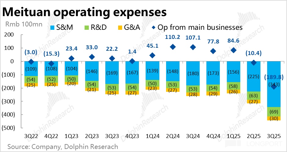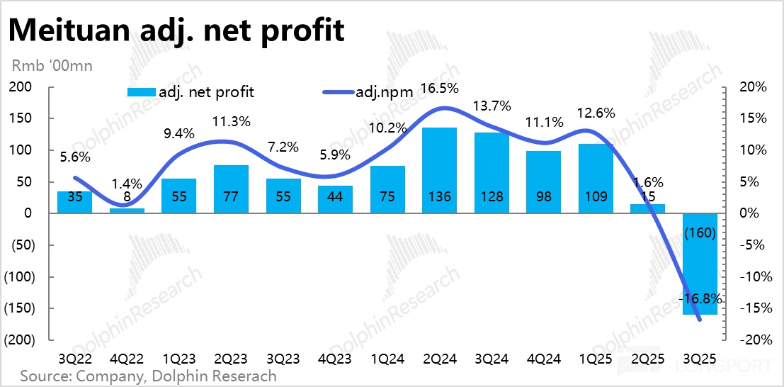 在海豚君看来,本次业绩中一个非常重要的数据是,在竞争最激烈的 3 季度内,美团付出的代价(包括亏损和少赚的部分),是挑战者阿里付出代价的 80% 左右。从单均盈利的角度理解,美团的单均 UE 从去年的 1.2~1.3 元(打包外卖 + 闪购),下降到本季的-2.5 元(都仅做参考),UE 同比变差了近 4 元。而阿里的单均亏损则是由去年的微亏几毛钱,到本季的亏损 5 点几元,UE 变差 5 元上下。