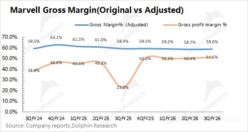 由于公司毛利率受收购资产摊销等方面的影响,因而财报中的毛利率并不能直接体现出经营情况。在剔除该影响后,海豚君参考调整后的毛利率,公司本季度调整后的毛利率为 59%。本季度毛利率环比略有回升,主要是由于毛利率较低的定制 ASIC 业务环比下滑,对整体毛利率产生结构性影响。