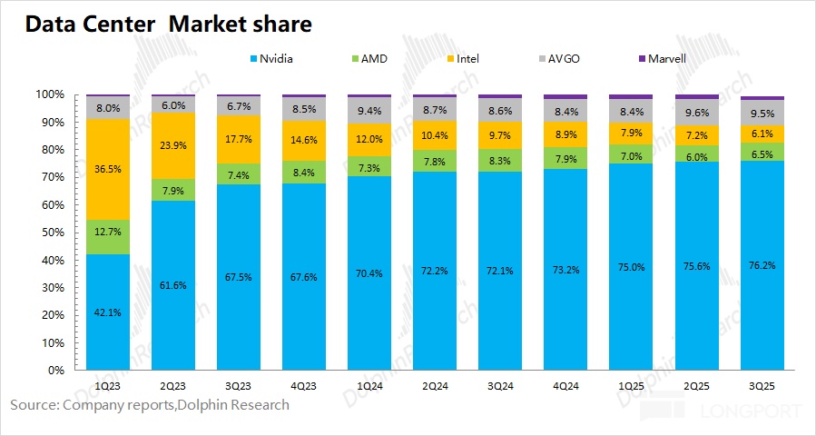 当前 AI 业务已经占据数据中心业务中的大部分,海豚君预期公司本季度 AI 收入约为 8.5 亿美元,环比下滑 0.1 亿;而非 AI 业务的存储等产品本季度实现环比增长当前 AI 业务占总收入的占比维持在 40% 上方,此前公司管理层的目标就是将 AI 收入占比提升至 50% 以上。