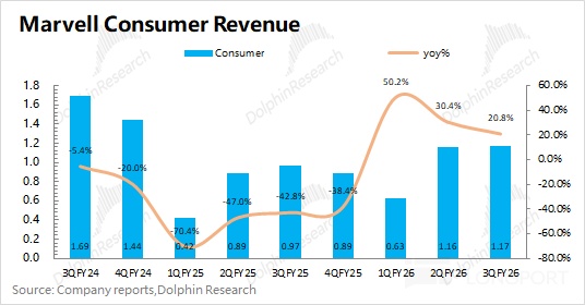 2)迈威尔科技 Marvell 在 2026 财年第三季度的消费电子业务实现营收 1.17 亿美元,同比增长 20.8%。公司消费电子业务,主要包括存储控制器、WiFi 芯片等产品,受季节性因素影响较大。