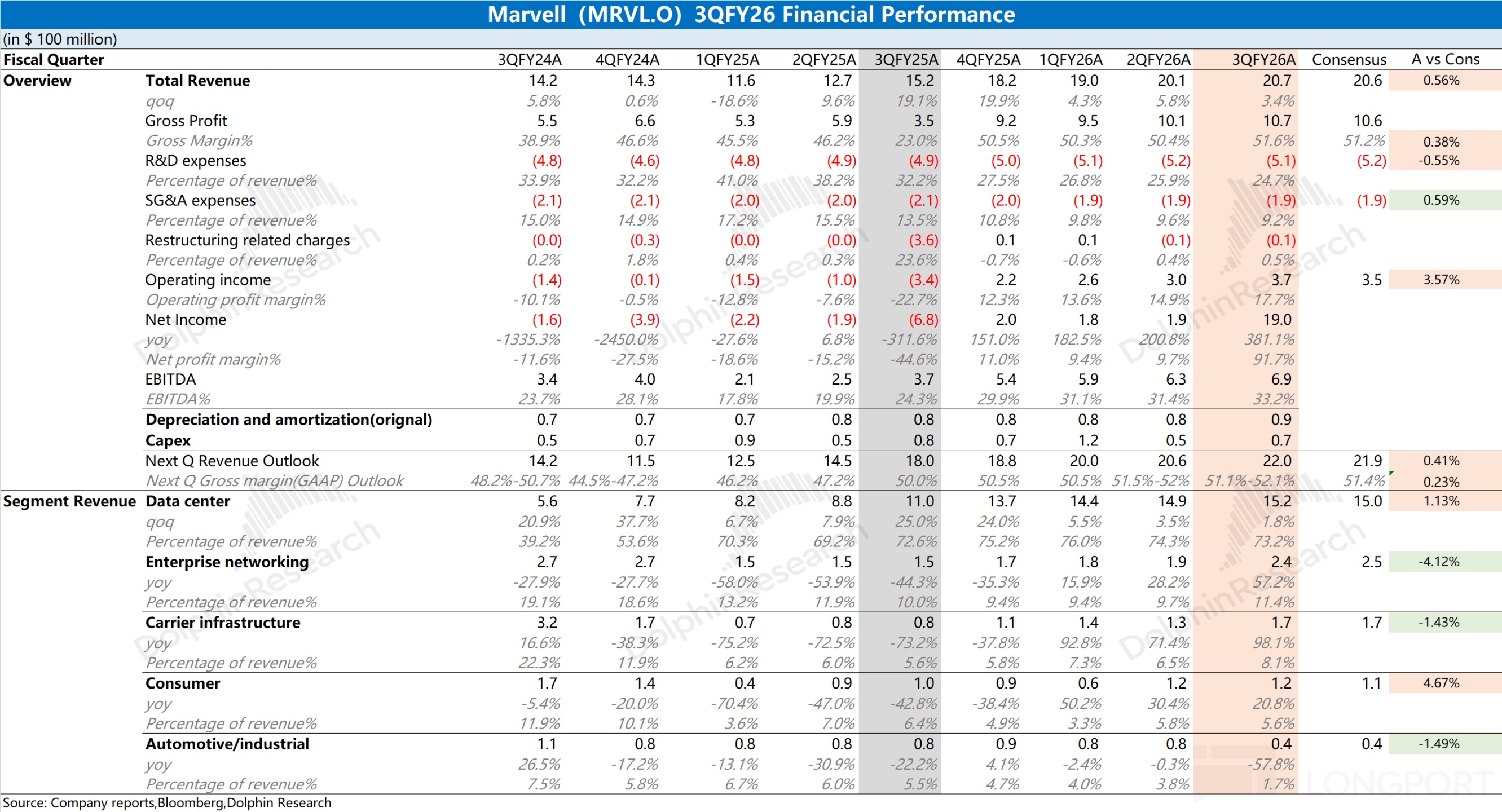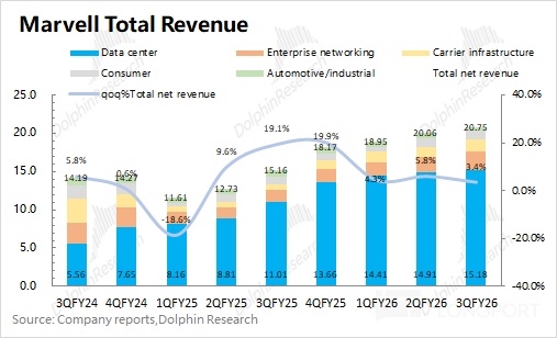迈威尔科技 Marvell 在 2026 财年第三季度实现营收 20.7 亿美元,环比增长 3.4%,符合市场预期(20.6 亿美元)。公司本季度营收端的增长,主要来自于企业网络及运营商业务的带动。受定制 ASIC 业务环比下滑的影响,数据中心业务环比微增。