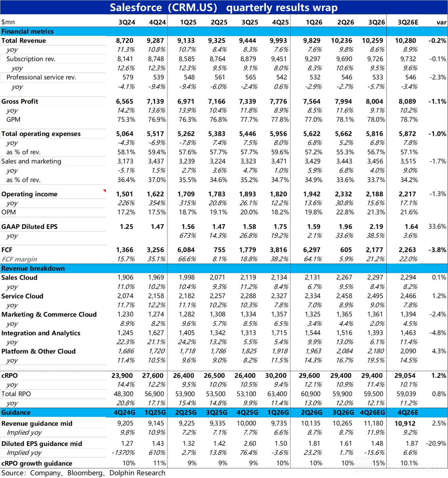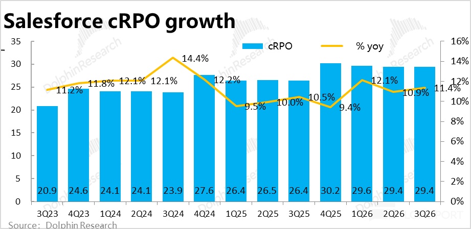 SaaS 龙头$赛富时(CRM.US) ,于 12 月 4 日早美股盘后,公布 2026 财年 3 季度财报(截止 10.31 日)。当季业绩并不好,各主要指标基本都跑输市场预期。相对欣慰之处是,领先指标(cRPO 和新签订单)在低基数下略有向好趋势。亮点是,公司指引下季度的增长会有不小改善,但主要是收购 Informatica 的并表影响,具体来看: