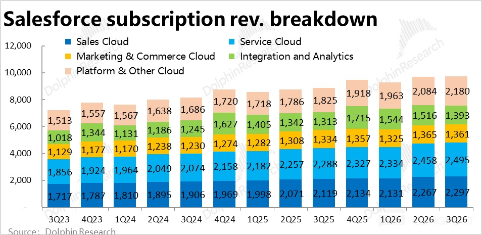 3)而目前 AI Agent 应用最广的客服云,以及作为所有 Agentforce 服务基础的平台云则表现不错。其中,服务云增 9%,增速环比略微走高 0.1pct,虽也不算强劲但对比其他业务线的放缓已属不错。