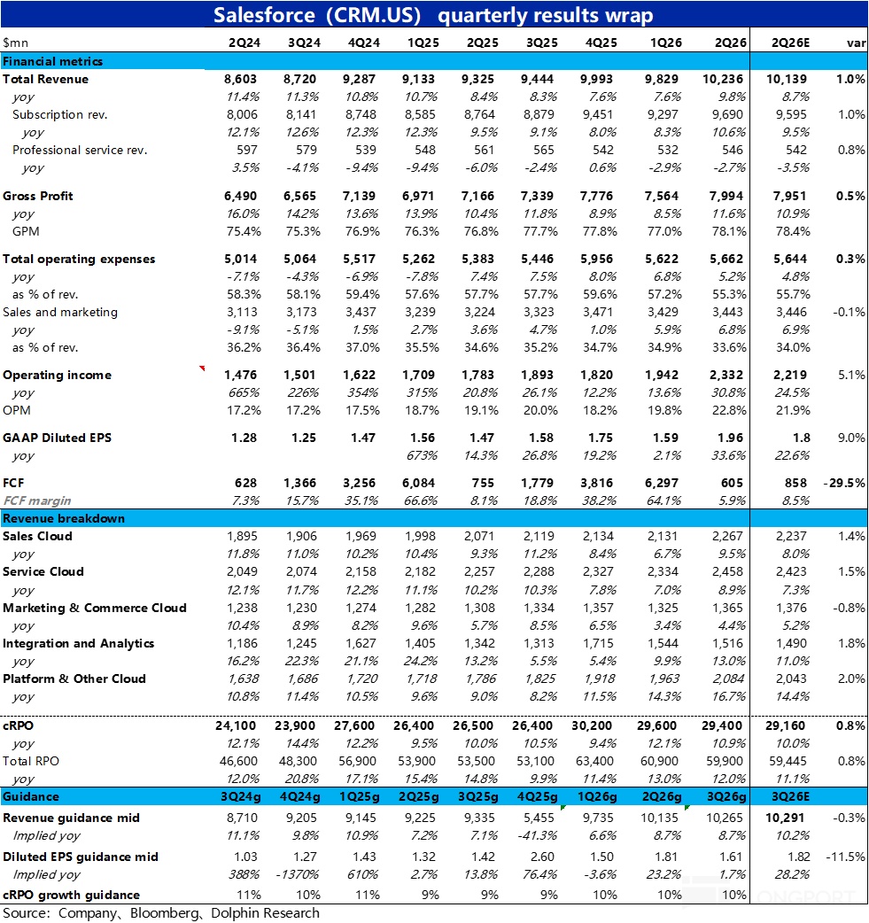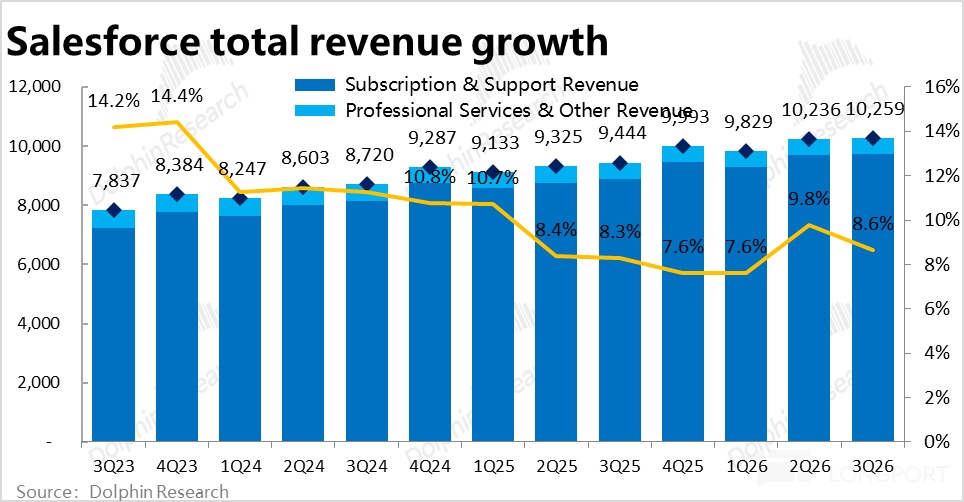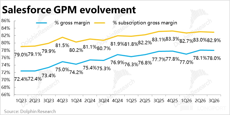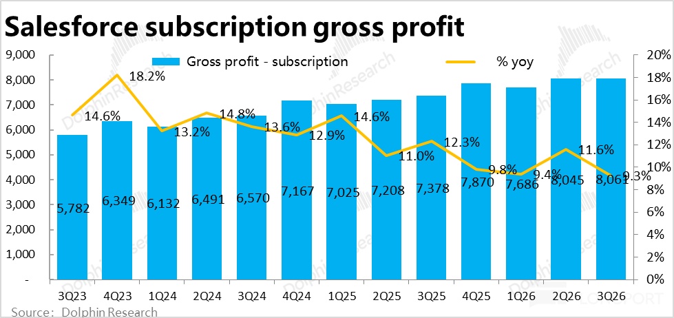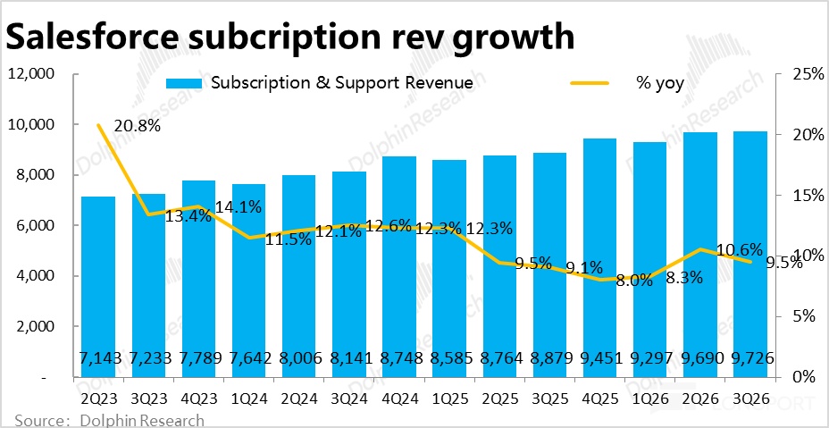 增长端,本季Salesforce 的核心业务 -- 订阅性收入约$97.3 亿,同比增长 9.5%,较上季又放缓了 1.1pct,略不及市场预期。从已经过去的后视镜看,增长仍然相当疲软,不仅没有再加速迹象,反在进一步放缓。