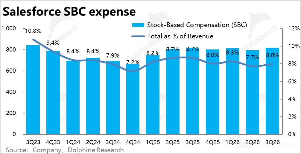 费用上,Salesforce本季总经营费用支出$58.2 亿,同比增长 6.8%,较上季略有提速但比市场预期稍低,也低于收入和毛利润增速。换言之,费用投入并没有因 Agentforce 等新业务的发展有非常明显的走高,仍是靠着控费(费用率同比下降了 1pct)对冲了毛利率走弱的影响,。