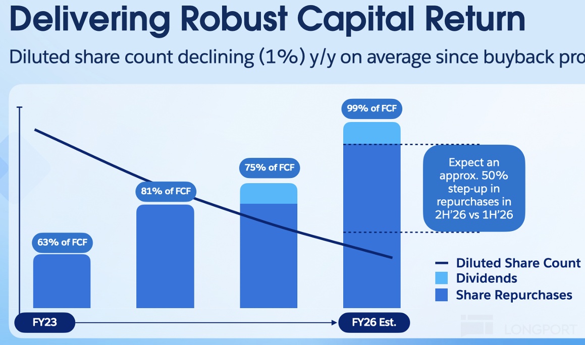 此外,如前文提及的,公司宣布了在下半财年将加大股东回报力度,26 财年计划将几乎所有自由现金流都通过回购或股息返还给股东。按 26 财年总共约$140 亿的回购总额,对应当前市值的 6.3% 左右。