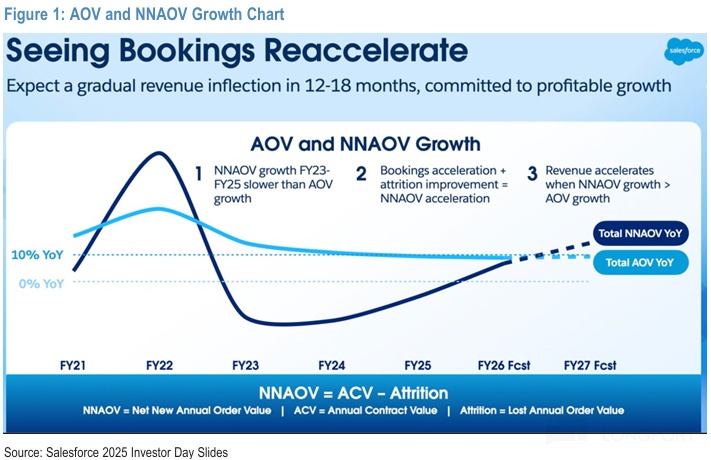 2)此外,公司在 10 月的 Dreamforce 大会上也给出了两个比较关键远期展望。首先,由下图可见,公司披露的NNAOV(Net-new Annual Order Value, 指剔除丢失的老合约后当年新增的净合同金额),在经历了 23~25 财年的负增长后,近期逐步改善且当前有向上突破 10% 增速的势头。 作为一个领先指标,公司预期在未来 12~18 月内这将传导到收入增长的再提速上。
