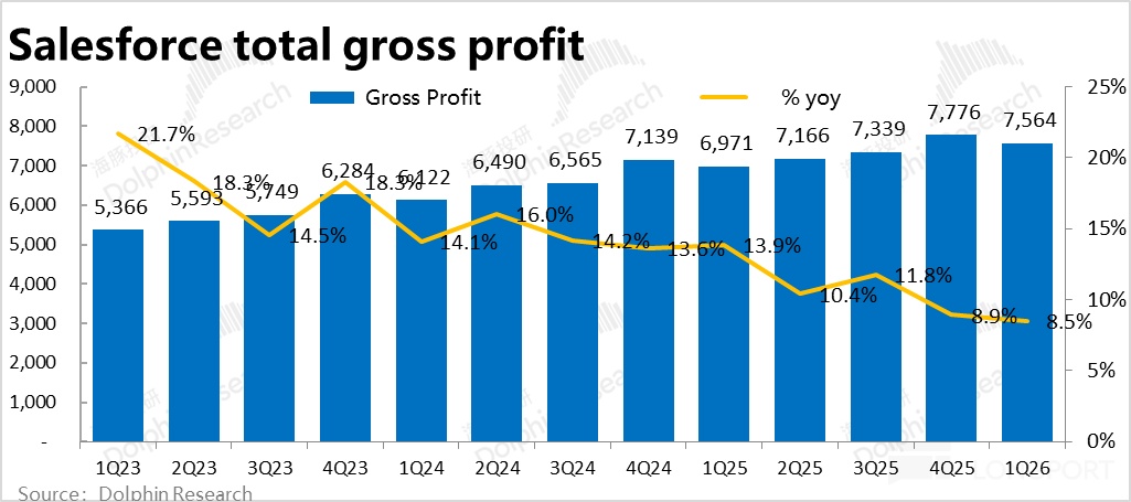 由上文可见,Salesforce 本季业绩表现显然算不上好。相比市场预期基本是全面跑输(除了控费)。且趋势上,收入增长继续放缓,毛利率也开始边际走弱,虽然控费效果依然出色,保住利润的增长仍算不错,但由于 AI 投入带来的毛利率下滑,利润领跑收入增长的幅度也还是在收窄的。