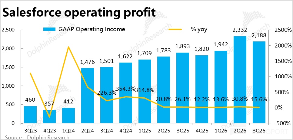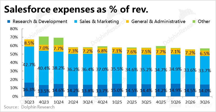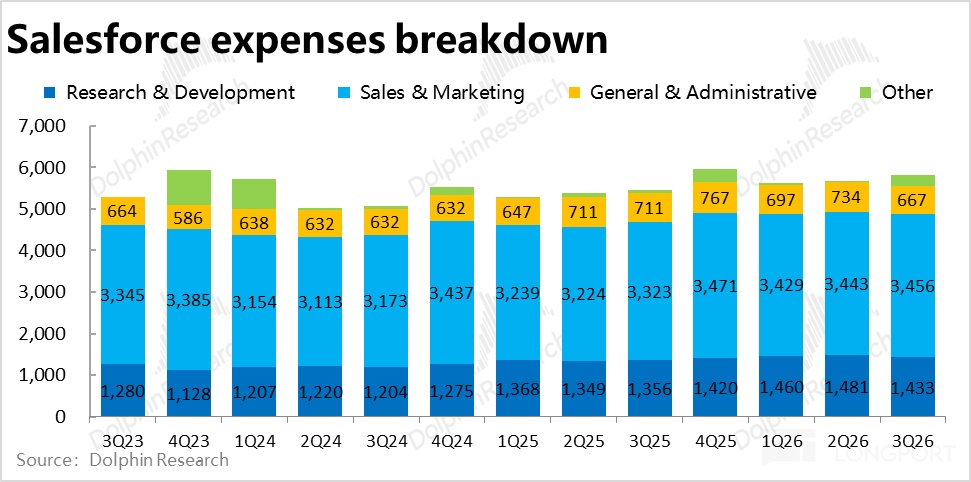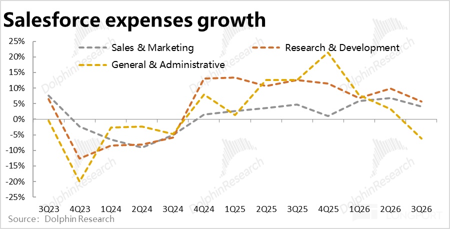 4、控费则依然优秀:Salesforce本季总经营费用支出$58.2 亿,同比增长 6.8%,较上季略有提速,但比市场预期稍低。其中,营销和研发费用都仅同比增长中个位数%,管理费用更是同比下滑约 6%。可见公司的费用投入并没有因 Agentforce 等新业务的发展有而有明显的提升。