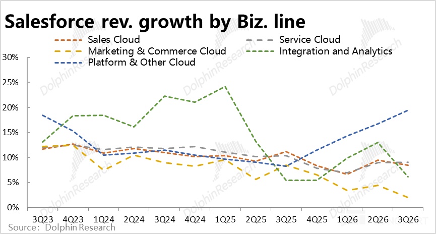1)传统业务中,商务&营销云的增长依然最弱,同比仅增长 2%,放缓了 2pct。最基石的销售云增长 8.4%,同样放缓了约 1pct。而分析业务(Integration & Analytics)增长 6%,放缓非常显著。