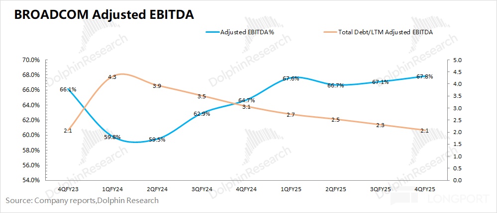 由于博通擅长外延并购,公司通常把调整后 EBITDA% 作为公司的经营面指标之一。而海豚君测算公司 2025 财年第四季度的调整后 EBITDA% 回升至 67.8%,好于公司此前指引(67%)。