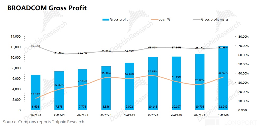 博通 BROADCOM (AVGO.O) 在 2025 财年第四季度实现毛利 122.5 亿美元,同比增长 36%。其中博通在本季度的毛利率为 68%,环比回升。
