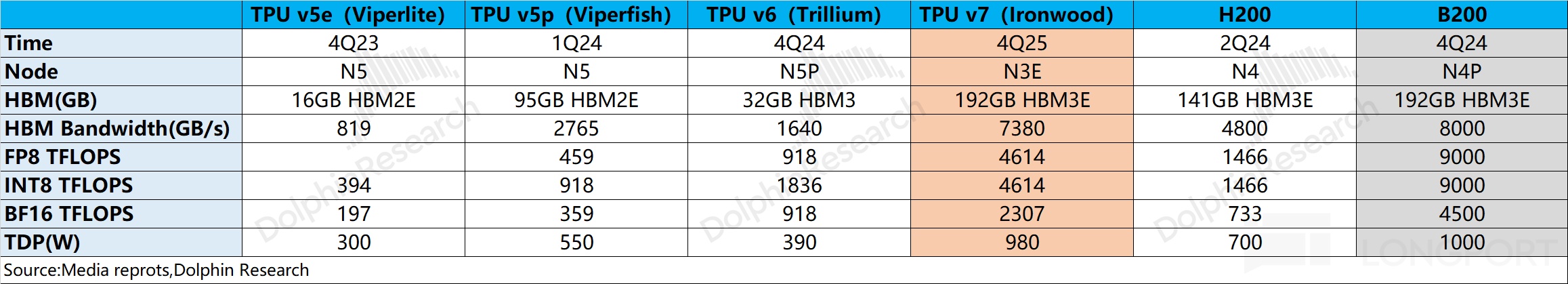 c)“谷歌 Gemini+ 博通” 竞争力的提升:一方面谷歌近期开始量产的 TPUv7 在性能上已经超过了 H200,部分指标也开始向英伟达的 B200 产品靠近;另一方面谷歌自身的 Gemini 大模型表现并不逊色于依托英伟达的 GPT 表现。