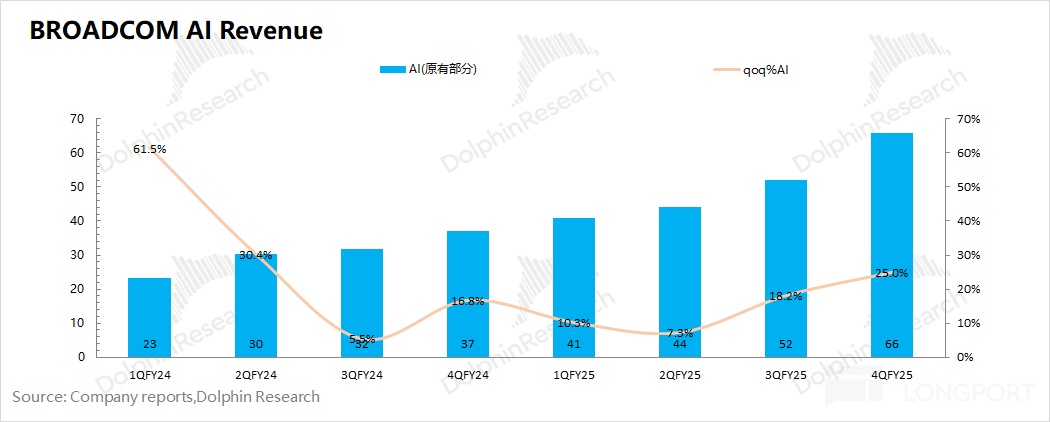 ①AI 业务:65 亿美元,环比增长 13 亿美元,好于市场预期(62 亿美元)。公司的 AI 收入主要来自于三大客户(谷歌、Meta 和字节),季度增长主要来源于大客户谷歌 TPUv6 出货增加的带动。