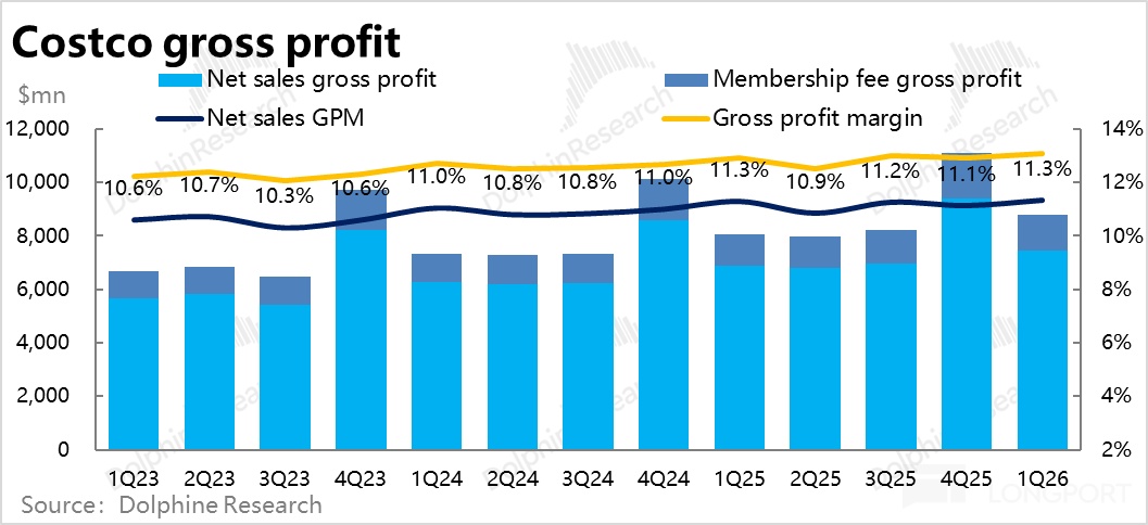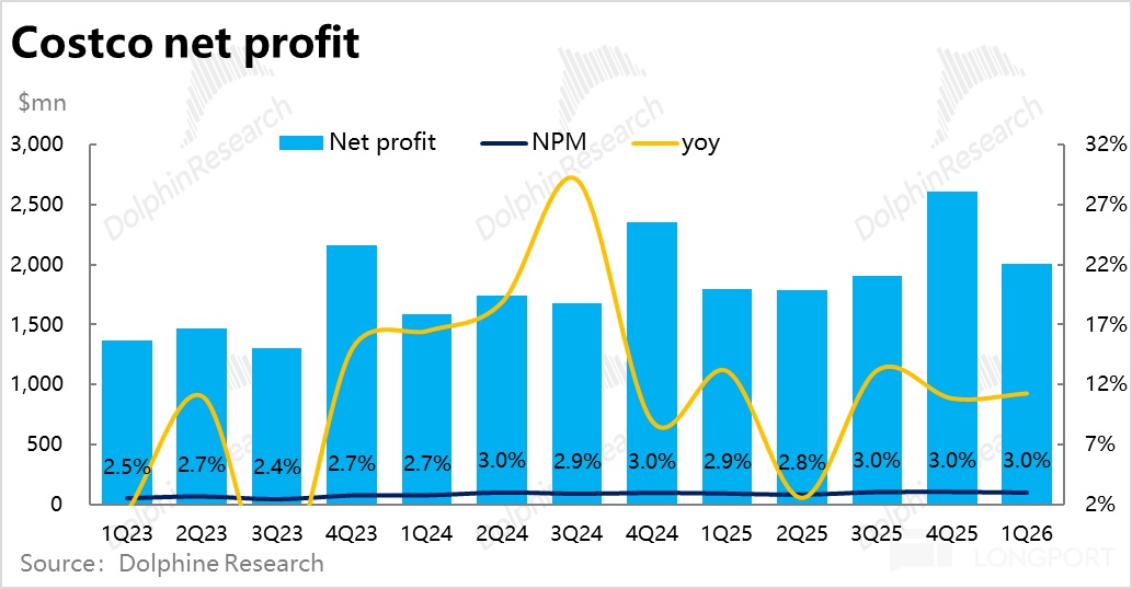 加上会费收入后,Costco 本季整体毛利率同比小幅提升了 13bps,利润额 88 亿,同比增长 8.6%。