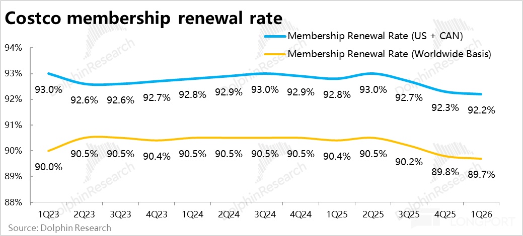 结合公司先前的解释,续费率持续下滑(以及本次反映出的普通会员净减少),主要是疫情后,Costco 通过线上渠道或者折扣渠道,拓展了大量的新用户。然而这部分用户中,有一部分未必适配 Costco 的模式,可能只是 “尝鲜或贪便宜”,且在会员有效期内没有被成功转化为忠诚用户,因此被清洗出去也并不意外。