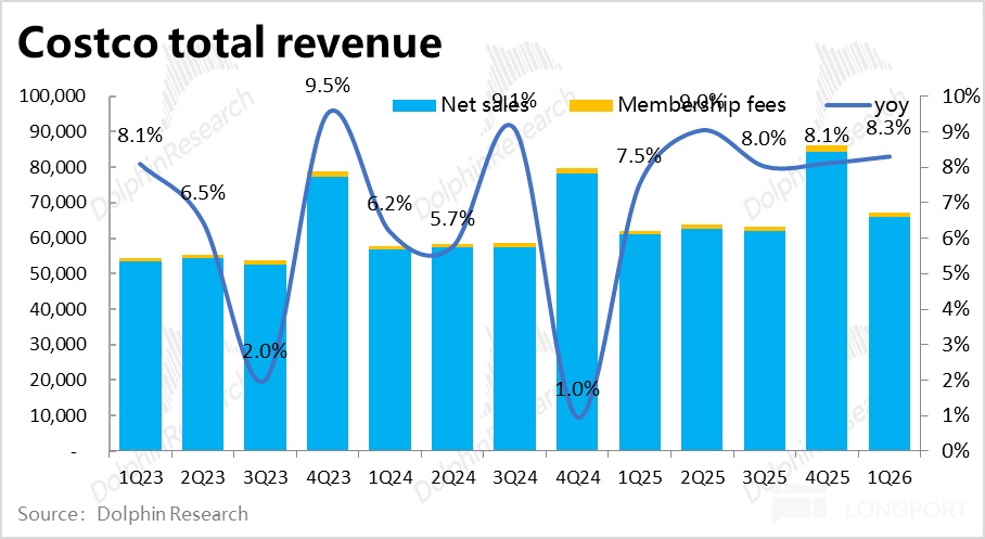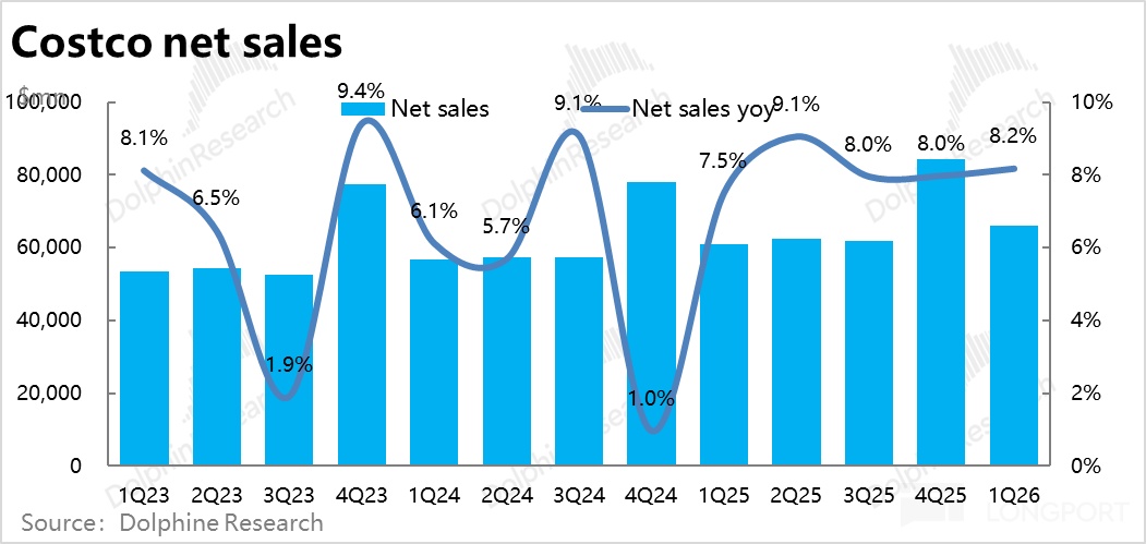 同时本季度内净新增了 9 家门店,和上季一致,继续保持着较高的开店节奏,相当于 1% 增长。因此本季度 Costco 整体商品销售收入同比增长了 8.2%,是较上季略有提速且略好于市场预期的。