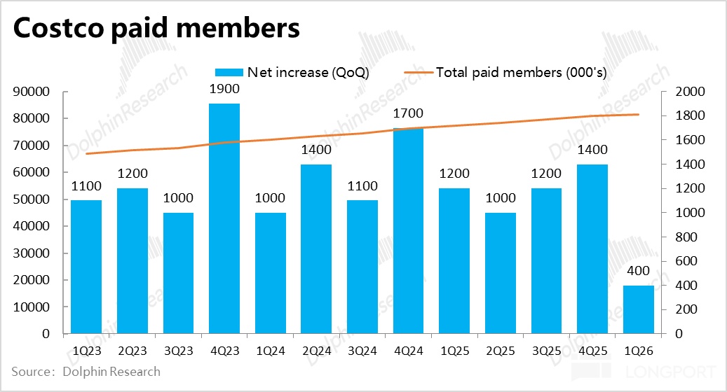 不过,我们也注意到虽然总会员仅净新增了 40 万,高等级 Executive 会员却净新增了 100 万人。这表明Costco 的会员在两级分化并提纯,最忠诚的高等级会员在增多,但相对边缘的一般会员则在净减少。