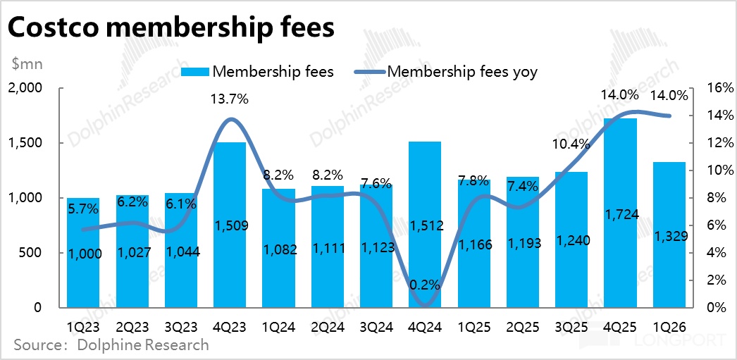 收入体量低但贡献可观利润的会员费收入本季约$13.2 亿,由于先前提价的红利期尚未走完,同比维持着 14% 的高增长。