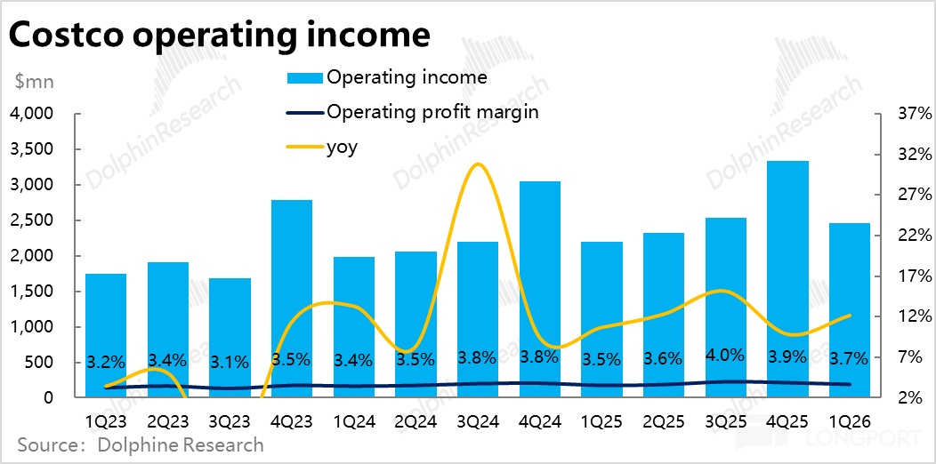 4、整体上由于毛利率和费用率各自提升幅度都不大,且毛利率提升幅度略高于费率的提升,因此,本季 Costco 整体经营利润率同比小幅提高了 13bps,最终经营利润额为 24.6 亿,同比增长 12.2%,终结了上季度跌至个位数% 增速的不佳表现。