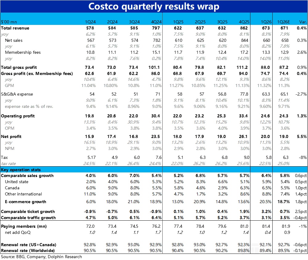 全球折扣零售王者—$开市客(COST.US) 于 12 月 11 日美股盘后,发布了截至 11 月 23 日的 2026 财年 1 季度财报。大体上业绩依然平稳,财务上的收入和经营利润增长有一定改善势头且稍好于预期。但更重要的经营指标上,同店销售/客流增速,和会员增长/续费率等仍表现不算好。