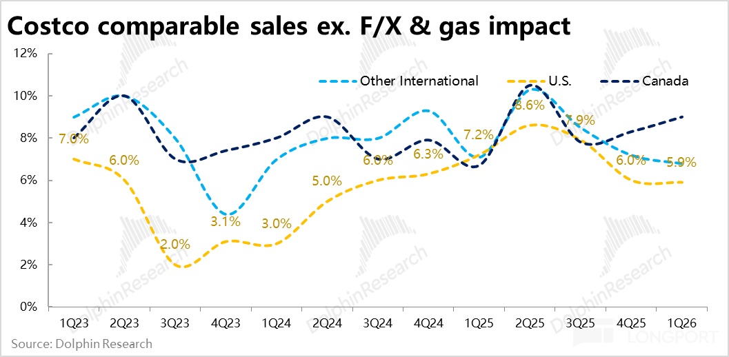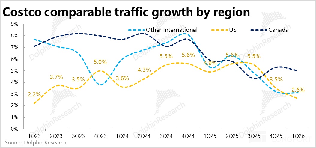 本后核心原因同样是,美国地区的同店客流增速从上季的 3.5% 再度明显走低到 2.6%,连续两个季度幅度不小的放缓,很难不让人怀疑 Costco 在美国地区的客群消费能力确实在走弱。类似的,加拿大增长坚韧背后也是因其同店客流仍保持着 5% 的稳健增长。