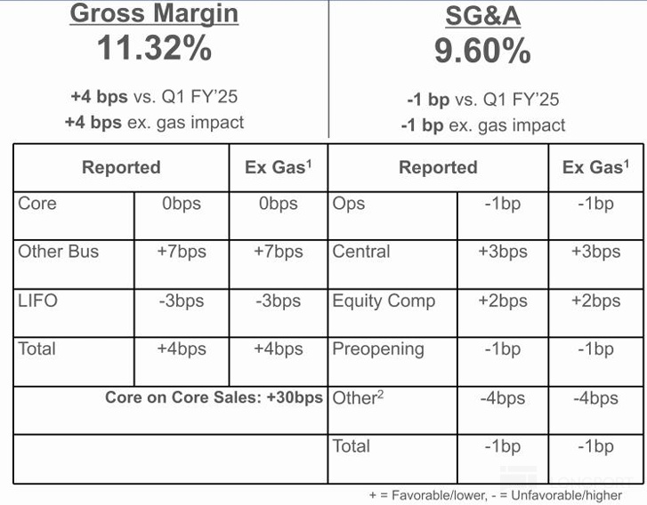 因此,同店销售增速的走高完全是由于平均客单价同比显著提升了 3.2% vs.上季的 1.9%。其中部分原因是先前油气价格和汇率的逆风影响在本季完全消退。