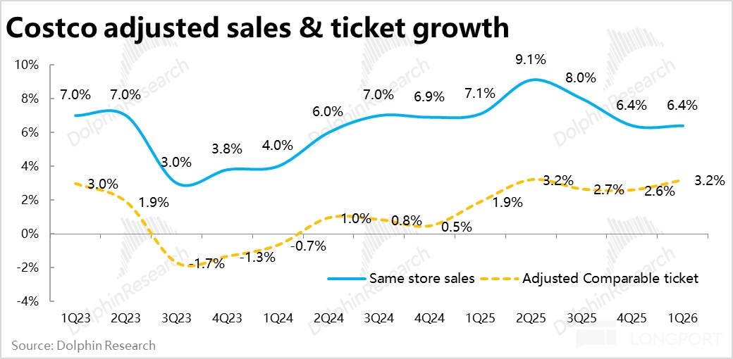 此外,剔除油气和汇率影响后客单价同比增幅由上季的 2.6% 提升到 3.2%,客单价同比涨幅依然是明显走高。结合管理层之前的沟通,在关税和人力通胀导致公司的采购成本和经营成本上升后,Costco 一直在尽力克制对商品提价,延后关税和通胀对消费者的直接影响,但最终仍是不可避免传导到终端售价上。