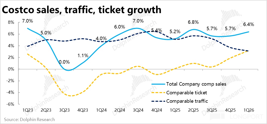 1、同店增长看似回暖,实际客流仍在走弱:Costco本季度整体同店销售增速为 6.4%,看起来比上季明显提速了 0.7pct。但实际上,同店客流量增速本在继续放缓,从上季的 3.7% 明显下降到本季的 3.1%,比市场预期的跌幅更高。