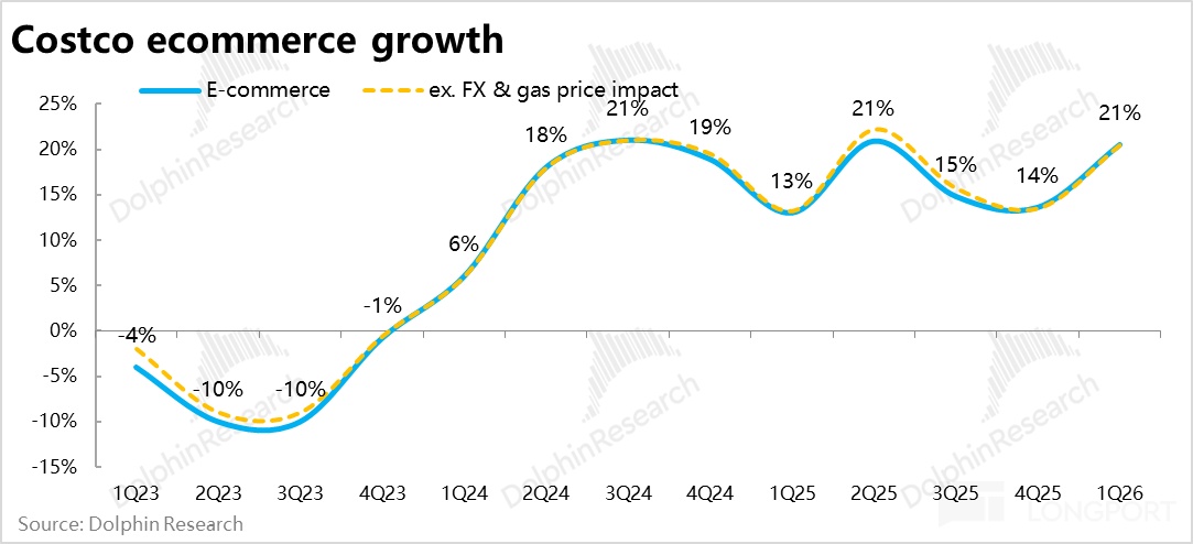 作为后疫情时代的增长新动力,Costco 本季电商销售额同比增长 21%,较上季大幅提升且比彭博一致预期的 18% 仍高出不少。不排除是因为公司近期调整了线上业务统计口径的影响,除了自营渠道外,目前已把通过第三方平台(如 DoorDash,Instacart 等)下单的同样纳入了统计口径。