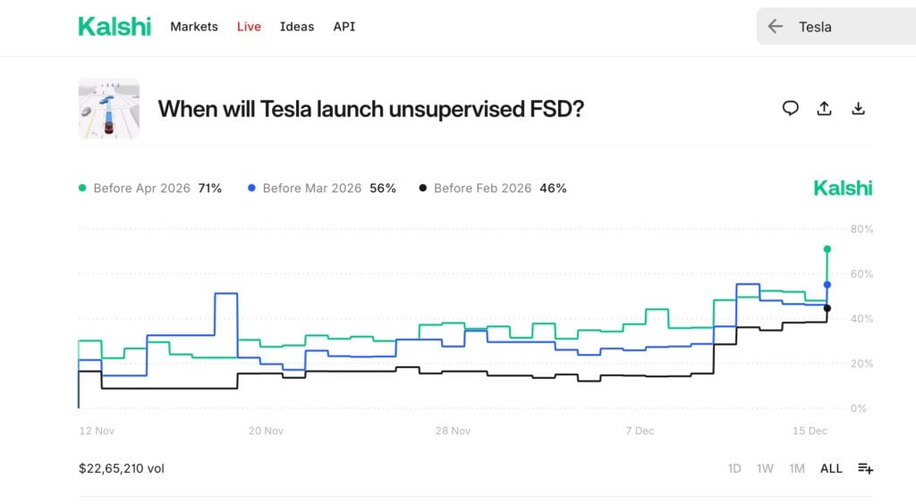 2、“群众雪亮的眼睛”——事件预测平台 Kalshi 认为特斯拉将有超过 70% 可能在 2026 年 4 月之前完全解决无人监督的无人驾驶问题。