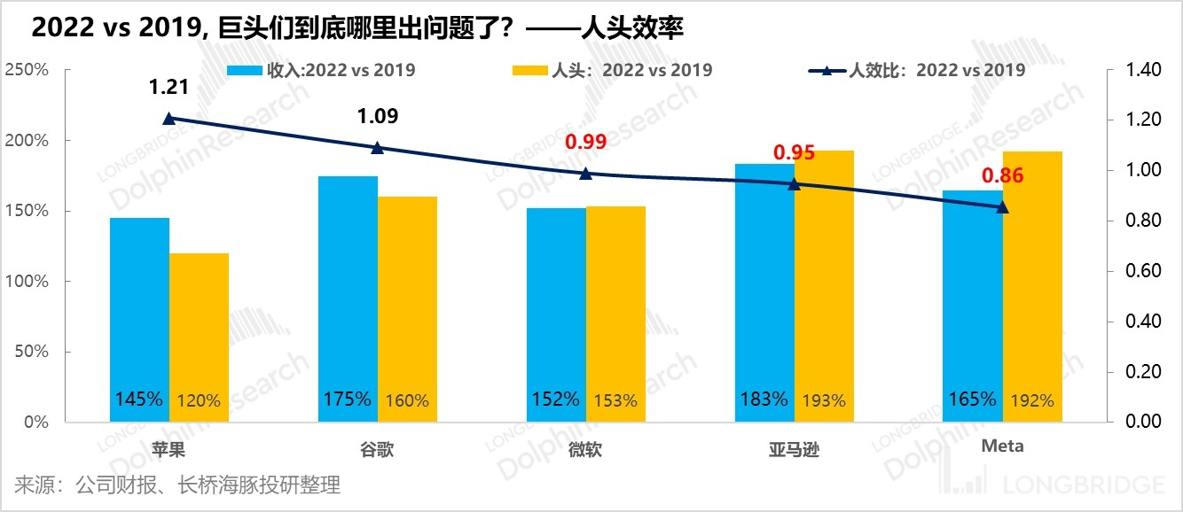 放一组数据来观察一下:在这波周期当中,招人过度,人头增速超过收入增速的依然是亚马逊和 Meta,微软依然居中,苹果和谷歌表现更好一些。