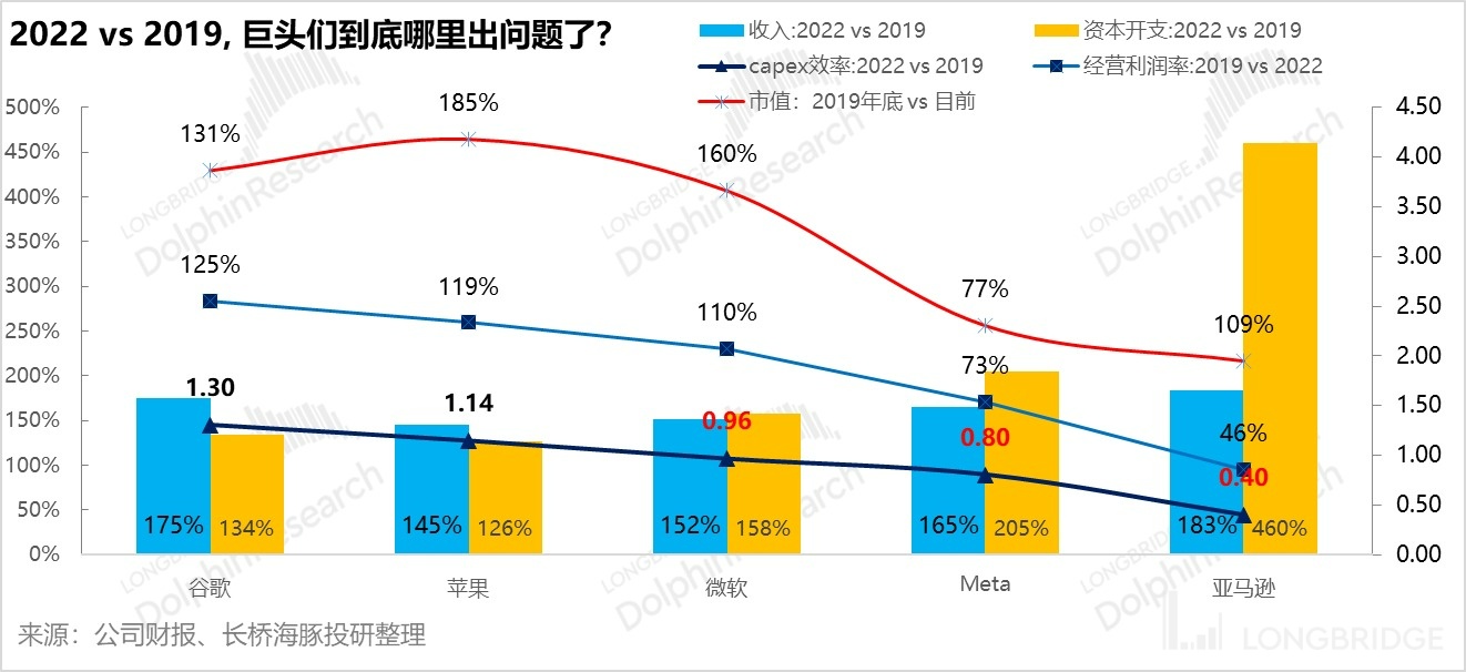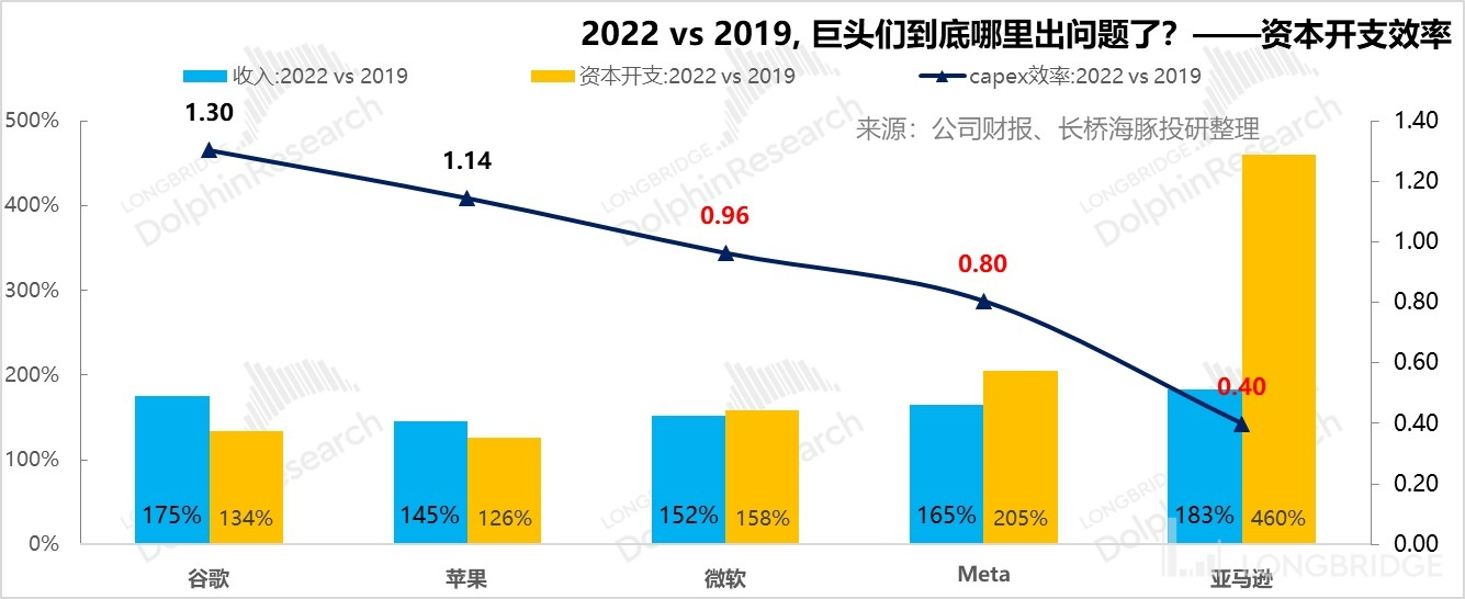 经过一轮猛投之后,到 2022 年底真正资本开支效率(资本开支的创收能力)有提高的,只有谷歌和苹果。