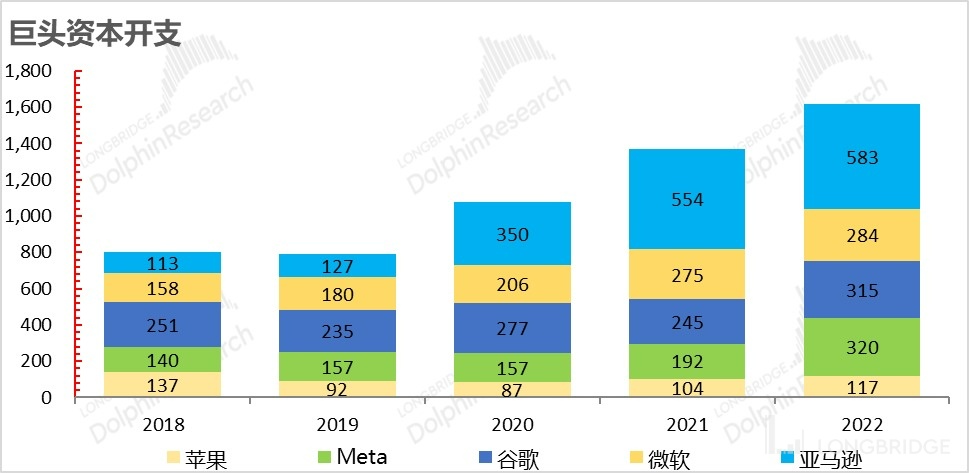 这波五大疫情红利巨头中,小扎一句 “All in 元宇宙” 让 Meta 的资本开支从 2019 年到 2022 直接三年翻番,一贯于提前两年预先投资基础设施的亚马逊,灵魂人物贝佐斯在退休前面临疫情暴涨的物流和配送需求拍下激进的资本开支计划,导致 2022 年底,亚马逊的资本开支整整是 2019 年的 4.6 倍。