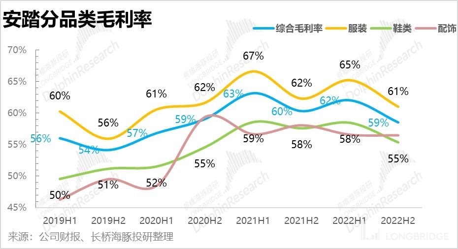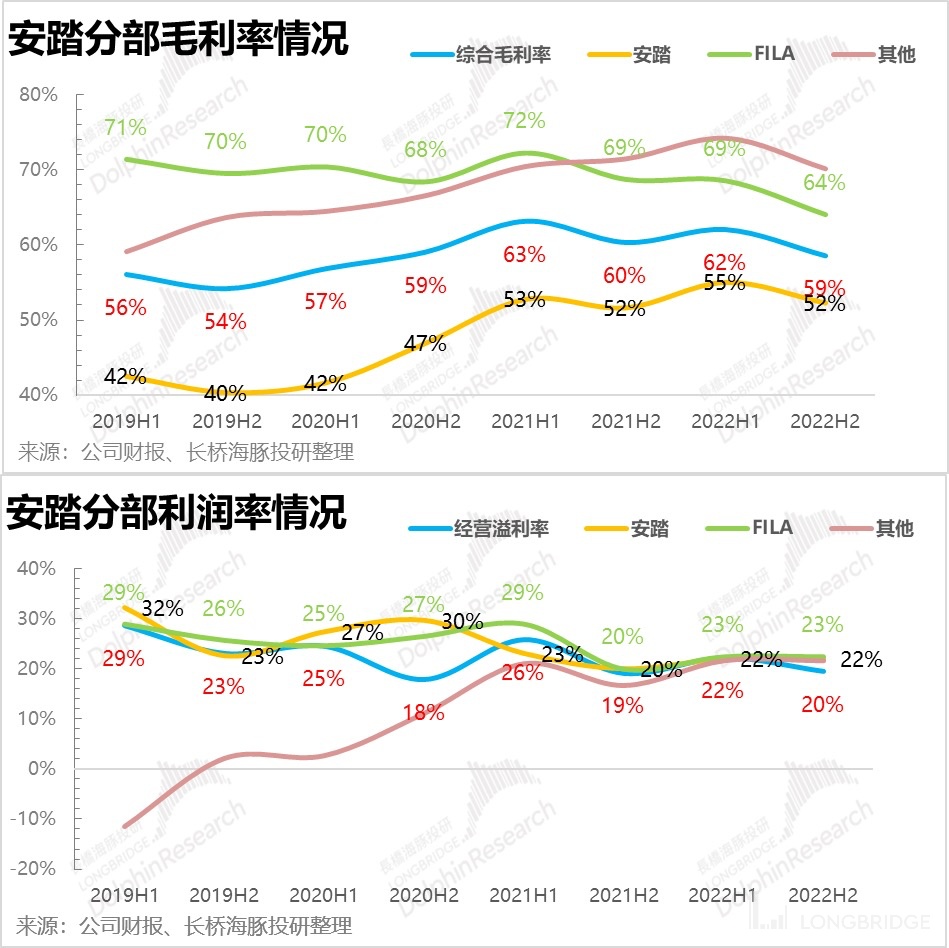 但是过去三年,伴随着安踏品牌在进行 DTC 模式转型,因而该分部的毛利率支部提升至 50% 以上(20 年以后变化非常明显)。