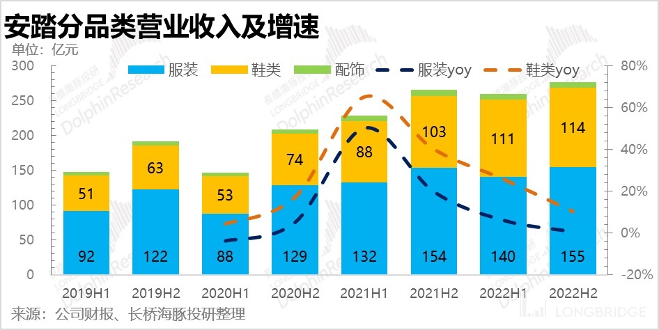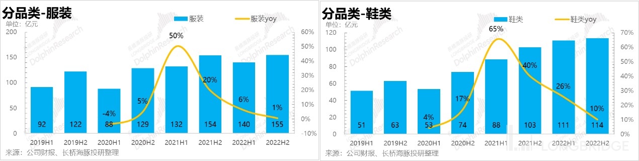 和李宁比较相似,安踏也是鞋类的增速更佳,并且上一年同期并不是一个小基数,安踏的鞋类产品已经连续三期站稳了 100 亿以上的位置(市场预期去年下半年为 98 亿),基本上确定了安踏整体能保持一定增长的大方向。
