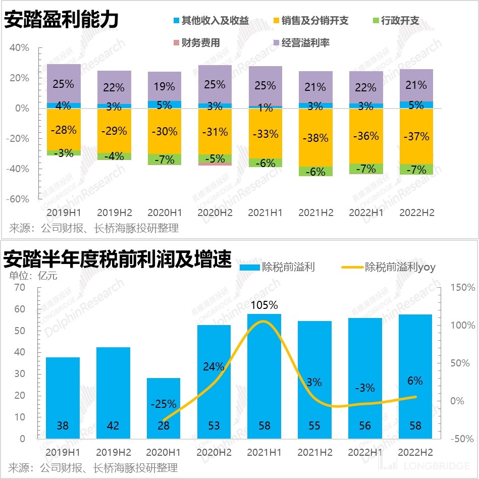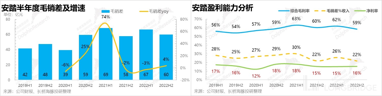所以,在销售费用得到一定控制的背景下,毛销差以及净利润这一块算是保住了。过去两个财报周期,安踏的毛销差都是呈现负增长状态,公司成长到一定的体量,面对市场环境不好,偶尔短时间的小个位数负增长也可以理解。不过前年下半年的基数并不算太低,有 58 亿元,公司能够维持,在费用的控制上还是花了一定心思的。