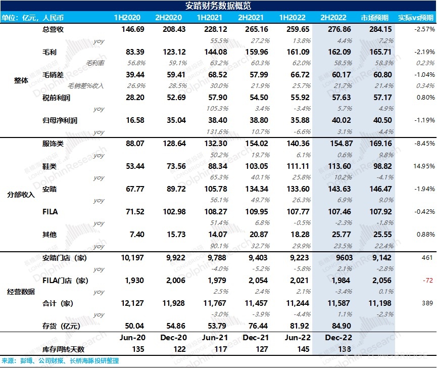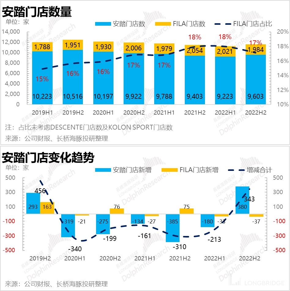 3.门店拓张:超过市场预期,与往期的门店净减少不同,去年下半年是安踏疫情以来首次出现门店净增加的情况,其中主要是安踏品牌门店的贡献(FILA 为净减)。从安踏品牌和 FILA 品牌过去三年的表现情况来看,控制 FILA、加强安踏品牌的拓展力度,无疑是比较明智的做法。