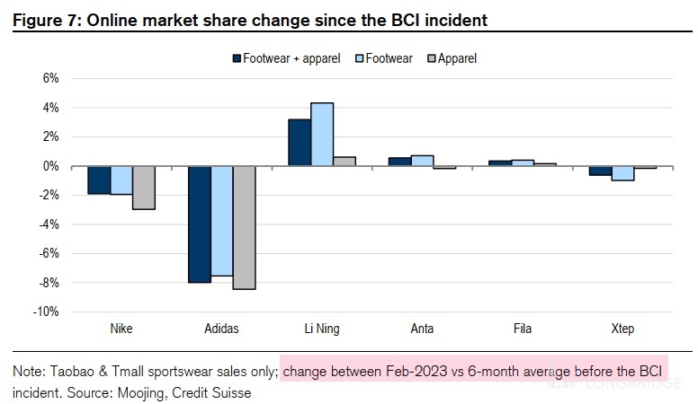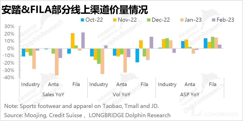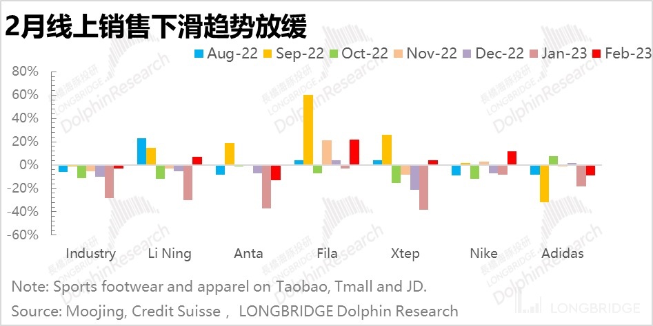 之前李宁的财报点评《生死勿论,背水一战?》我们提到过,行业去年过得十分艰难,国内运动服饰行业零售额同比增长仅为 2%。而今年 1-2 月社零数据中,貌似有一些萌芽的状态(并且是基于前一年同期冬奥会的高基数背景下)。而从线上最新的监测数据来看,各品牌似乎是有一些缓和(李宁和 FILA),行业的下滑趋势也在放缓。