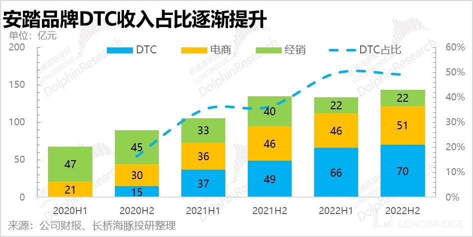 尤其是去年下半年,通过电商以及国内持续做 DTC 模式转型有正面贡献,使得安踏品牌还能有个位数的增长。公司自从 20 年做 DTC 以来占比提升的很快,很快就达到 50%。这样做的优势优势在于可以更有利的管理渠道,保持增长的稳定性,但是同时也将背负着更多的存货。