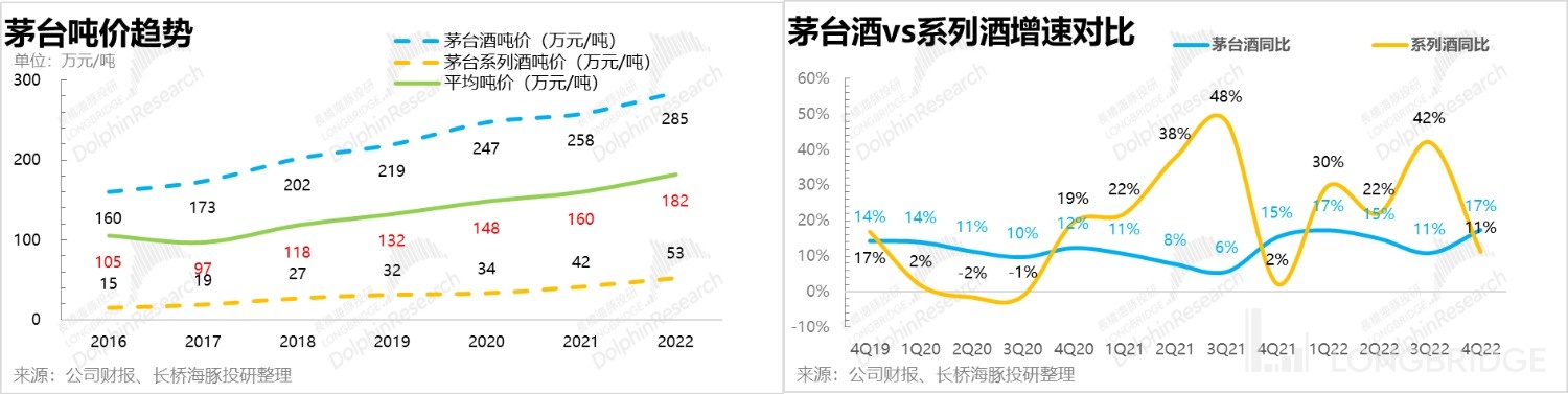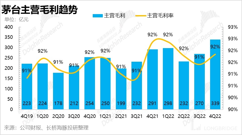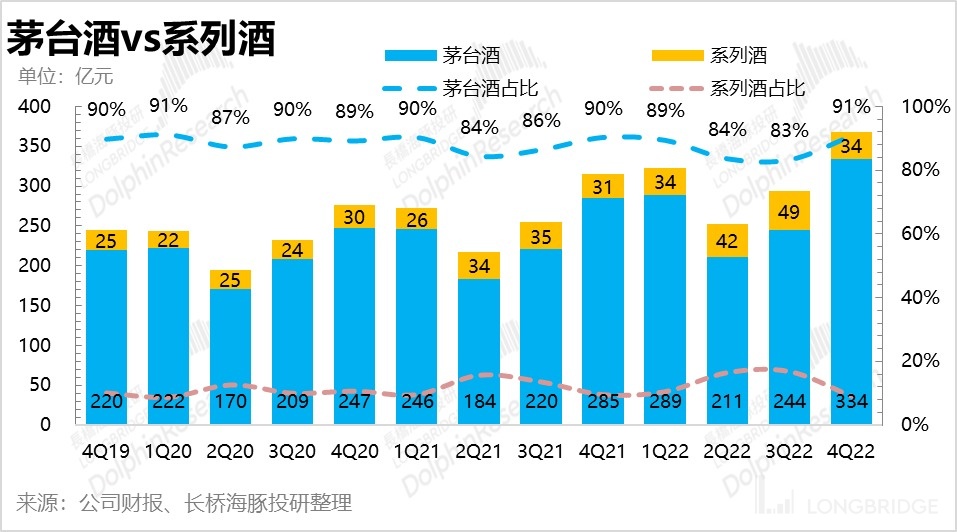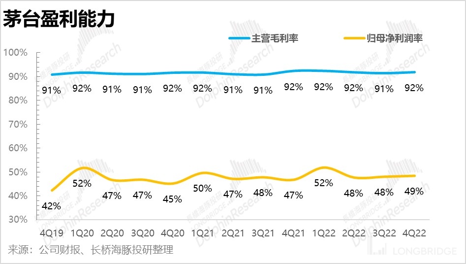 茅台一直是以 “茅台酒” 与 “系列酒” 进行双轮驱动。作为茅台的定海神针,“茅台酒” 的占比一直保持在 90% 左右。去年四季度之所以毛利率站的比较稳,利润增速更快一些,和去年四季度当中 “茅台酒” 的占比有短暂的提升到了 91% 有着莫大的关系。
