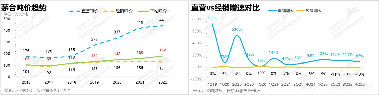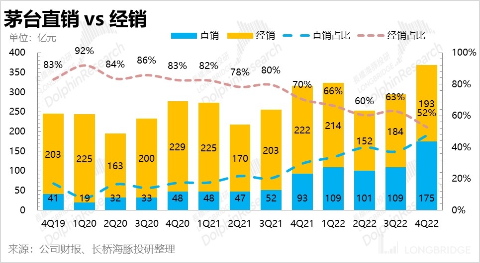由于直销扩大的影响,相应的,经销的收入虽然受到一丝挤压,但是下滑幅度全年还能控制在 10% 以内,四个季度的降幅都比较均衡,一季度由于没有 “i 茅台” 的挤压,降幅稍微偏低一点。
