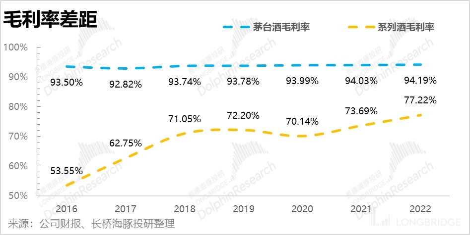 另外,两者在毛利率方面也有不小的差距,虽然系列酒的毛利率提升的很快,但是由于吨价水平,至今仍旧不能和 “茅台酒” 的毛利率放在一个水平比较。