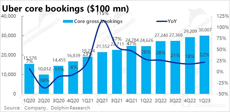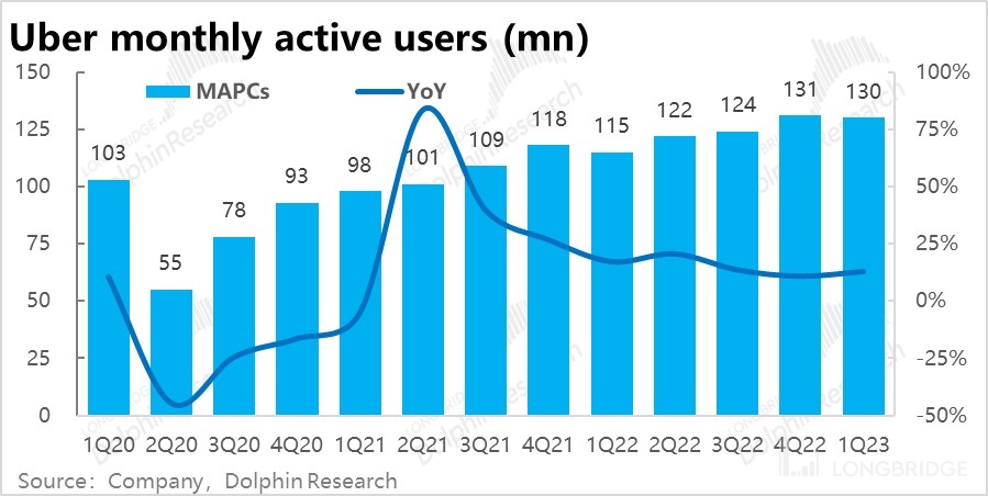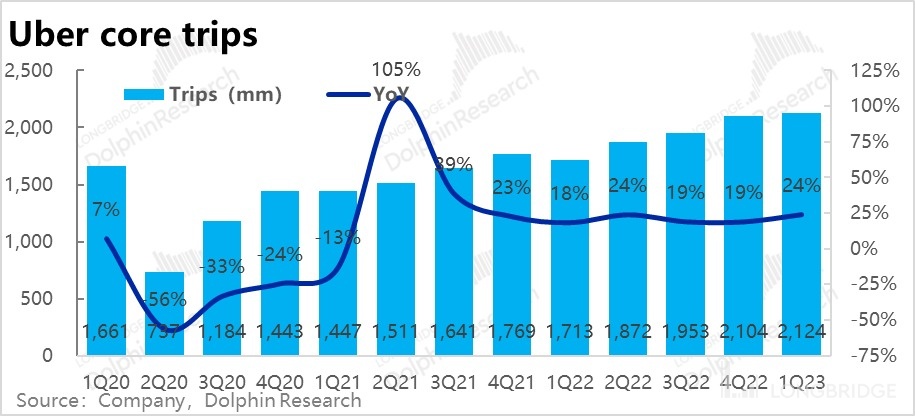 具体来看,本季打车业务营收 43.3 亿美元,显著高于市场预期的 40 亿。剔除商业模式变更的影响后,“真实” 营收约 32 亿,同比增长了 39%,较上季度提速了 9pct。