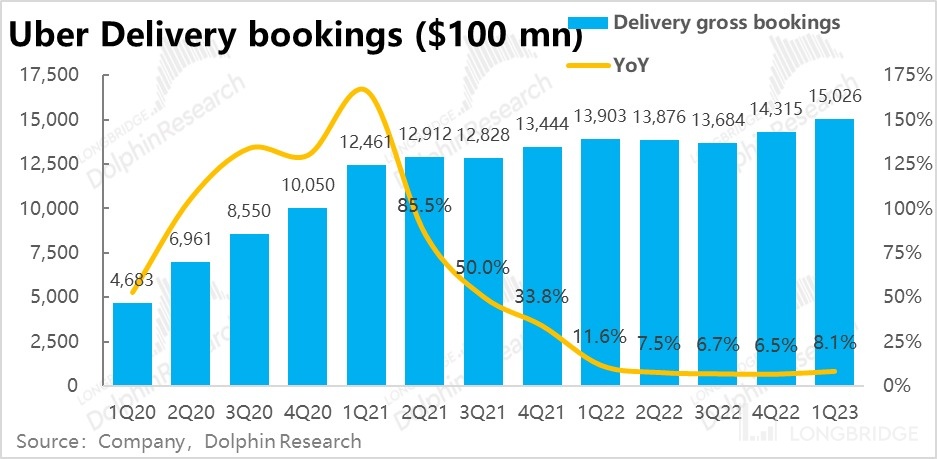 打车(Mobility)板块一季度实现订单金额 150 亿美元,稍高于市场预期的 147 亿,同比增速也由 31% 提速到近 40%。外卖业务(Delivery)实现订单金额 150 亿元,增速也由 6.5% 提速到 8.1%,逆转了先前连续 7 个季度增速放缓的趋势。